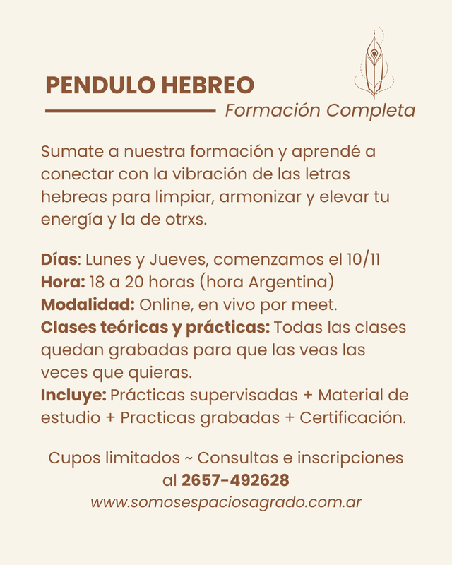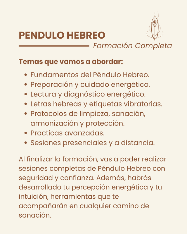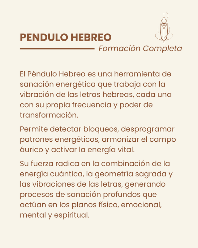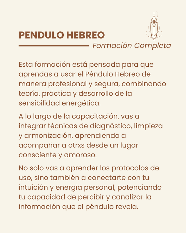 Con el Péndulo Hebreo podés aprender a leer y trabajar con la vibración de las letras hebreas para liberar bloqueos, equilibrar tu energía y acompañar a otrxs en su proceso de sanación.