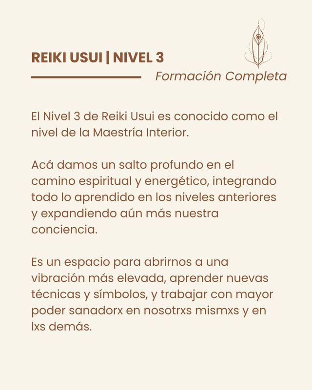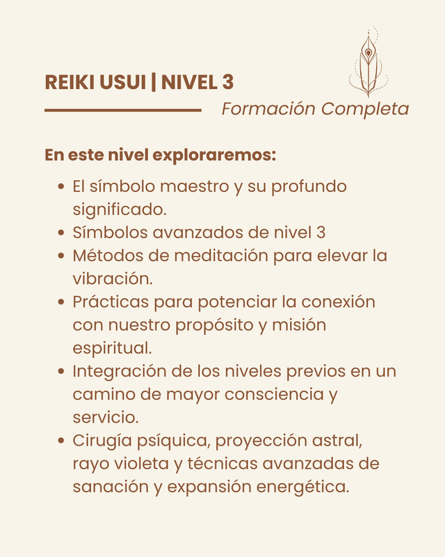 En este nivel vamos a transitar prácticas como cirugía psíquica, red de cristales, proyección astral, rayo violeta, caja de luz, sanación con las manos, estrella Kahuna, pantalla de cine, Reiki vibratorio, recibirán los símbolos maestros de nivel 3.